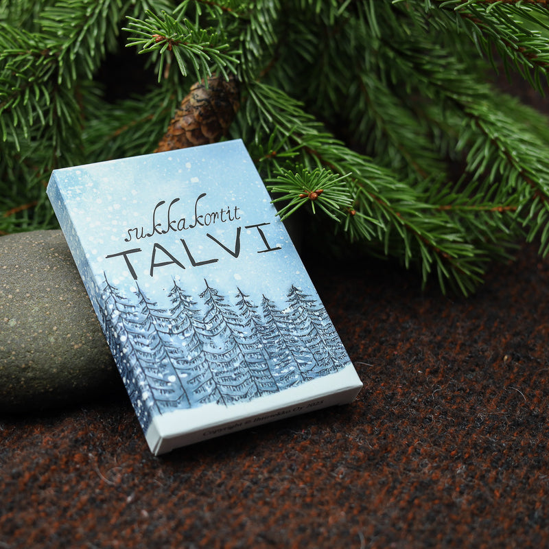 Nosta kortti ja anna sattuman johdattaa tai kerää sukkakorttien kuvioista mieluisin yhdistelmä ja neulo itsellesi sukat, joilla on tarina. Pakka sisältää 24 korttia, joista jokaisessa on kirjoneulekaavio ja suomalaiseen perinteeseen perustuva värssy. Voit valita kuviot pakasta sattumanvaraisesti tai yhdistellä kuvioita, neuloa niitä ylösalaisin tai valita kortit, joiden aihe koskettaa sinua eniten. Värivaihtoehdoiksi näihin kuvioihin sopii niin neutraalit ja harmoniset sävyt kuin villimmätkin versiot jos sellainen tuntuun enemmän omalta. Kaavion kuviot on kirjoitettu kahdelle värille, mutta vain talvinen taivas on rajana väriyhdistelmien keksimiseen.