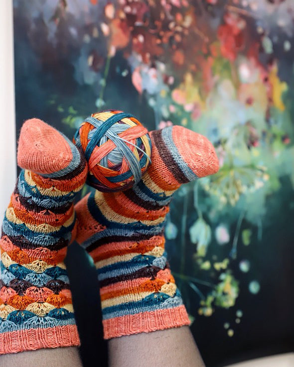 Lanka syntyi yhteistyönä ja inspiraationa oli Kaisa-Tuulia Tuomen taulu Kaiku. Sukkaohje rikkoo hauskalla ja kekseliäällä tavalla raidoittuvan sukkalangan rytmiä.